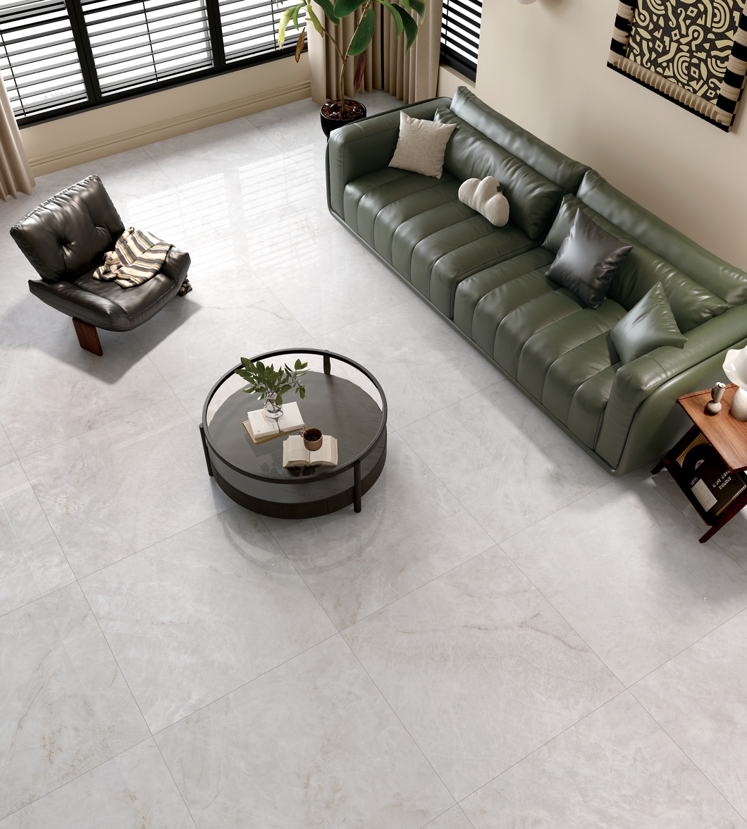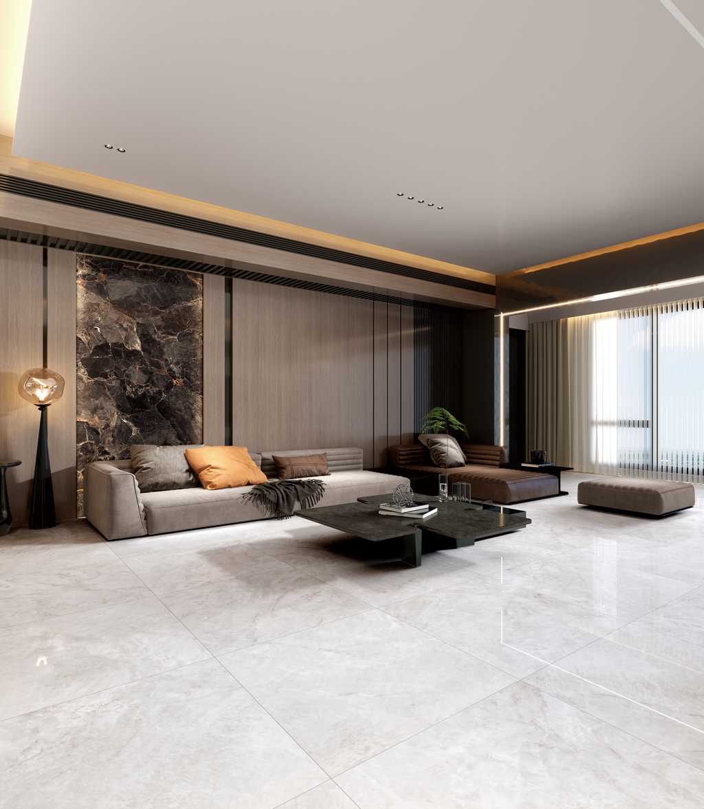 銀灰色的磚面上附著這大片絮狀紋理,形成了絢麗的銀灰色版面,猶如云母貝獨(dú)特的生長(zhǎng)紋,高透柔美的玉質(zhì)凝脂感和均勻的質(zhì)地,在光線照射下泛起溫婉細(xì)膩的虹彩。