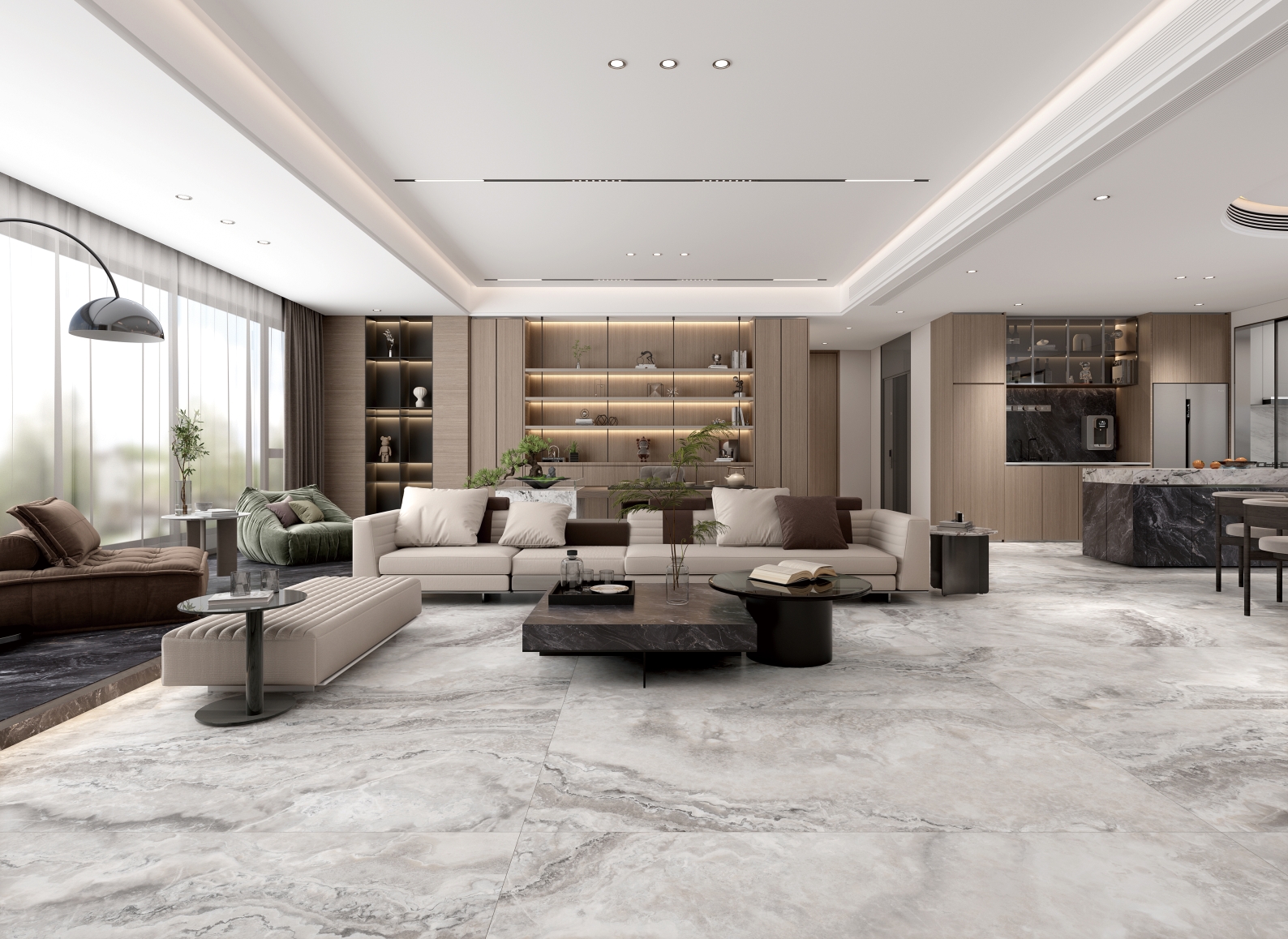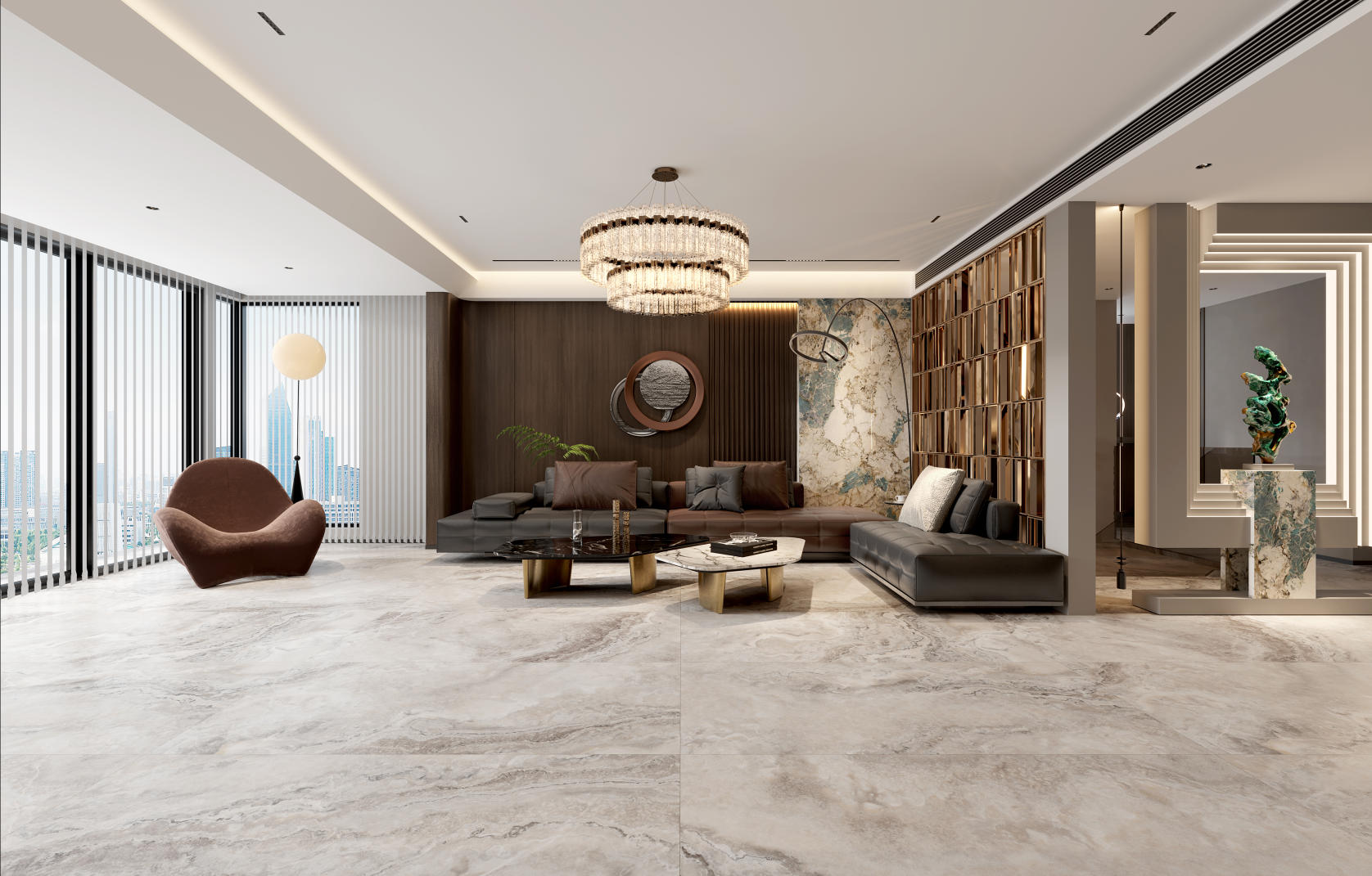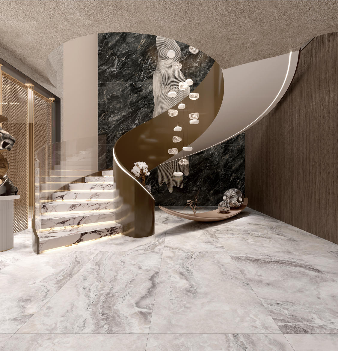 汲取瑪瑙石的自然精髓,復(fù)刻著大地脈絡(luò)那蜿蜒曲折的線條,以棕色的溫暖沉穩(wěn)為基調(diào),輔以白色紋理如云朵般輕盈飄渺。肆意流動(dòng)的紋理宛如山川河流,細(xì)膩或粗獷,賦予動(dòng)態(tài)的生命力,如同自然界的河流在山間自由穿梭。既展現(xiàn)了瑪瑙石的溫潤(rùn),又不失現(xiàn)代感的簡(jiǎn)潔與明快。