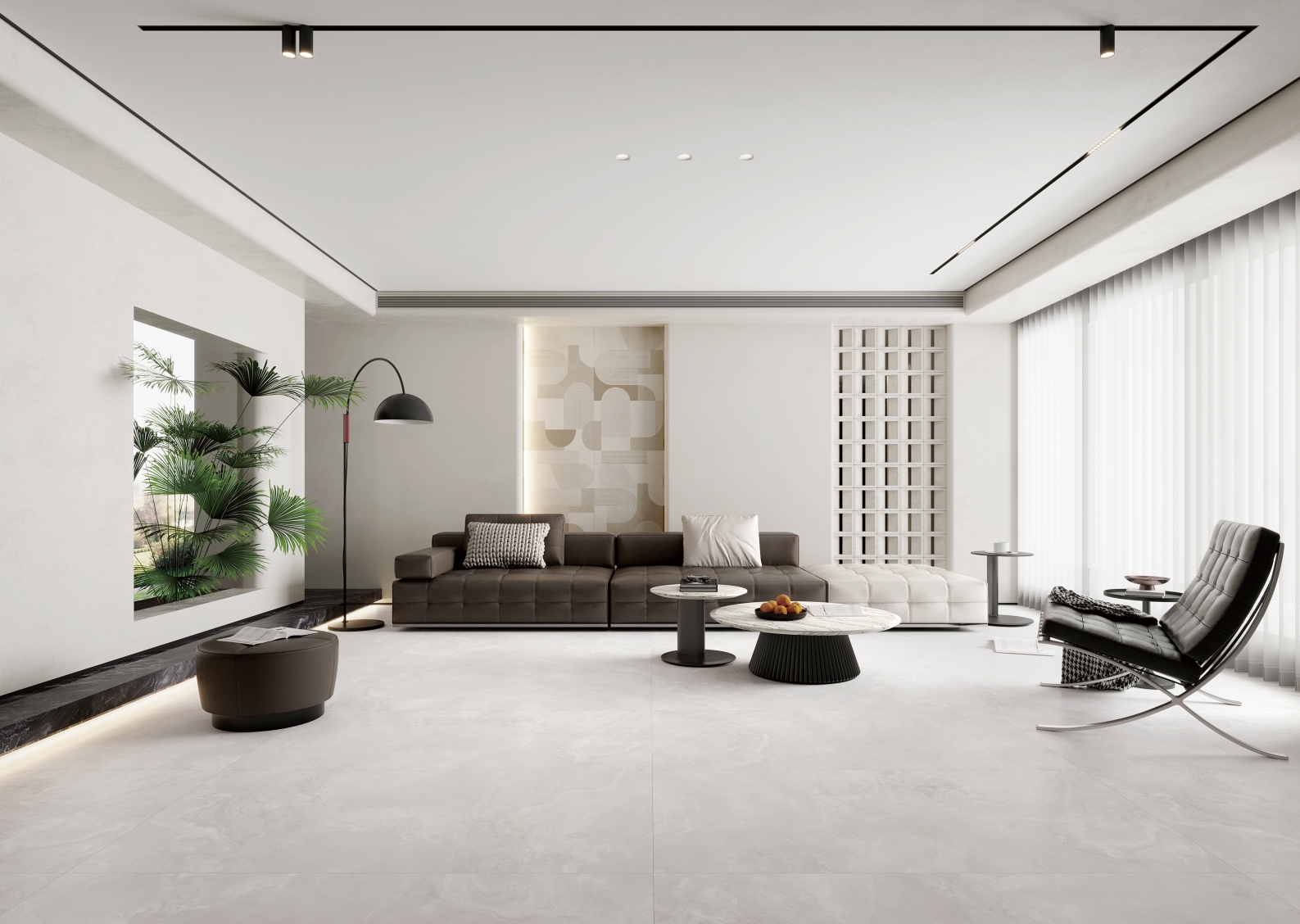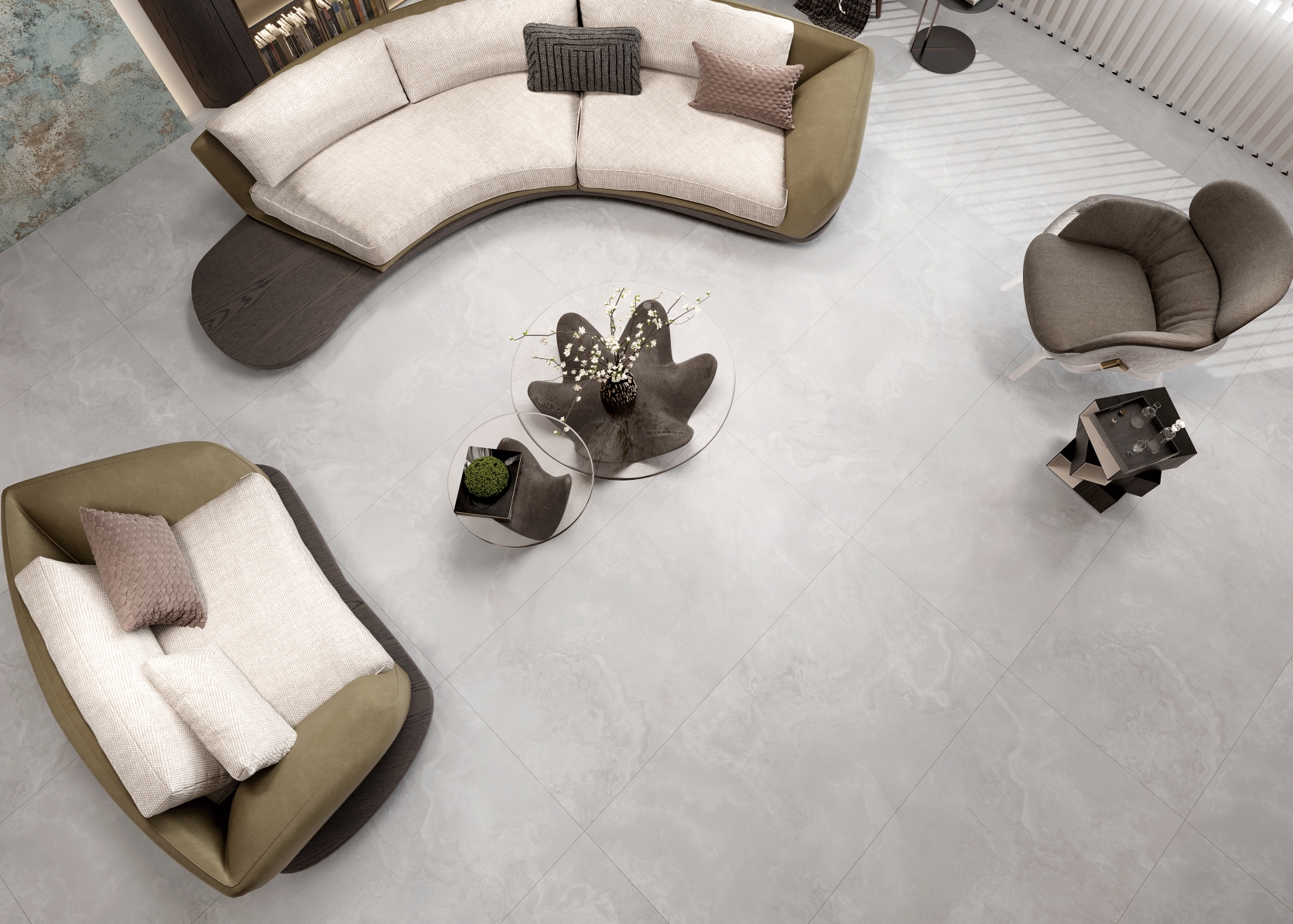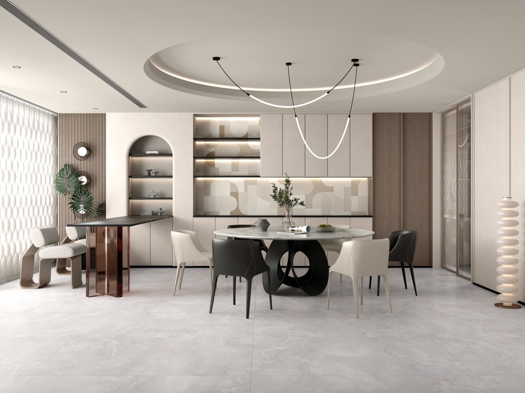 自然通透細(xì)膩,灰色線條、肆意飄散的紋理,深淺變化不一縱情延伸, 在空間里獨(dú)自綻放光彩,營(yíng)造了獨(dú)特隨性的空間氛圍。