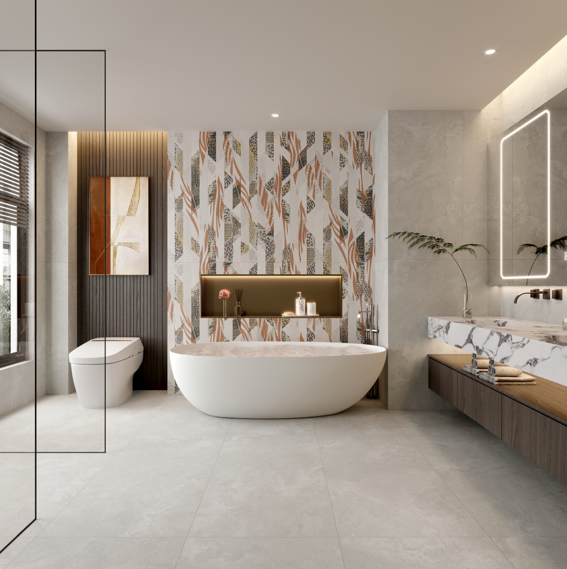 棕櫚樹、豹紋等代表著非洲的獨特印記,通過不規(guī)則的設計排列,將狂野與活力鐫刻在磚面上,盡享原生態(tài)的自由隨性、野性自然。