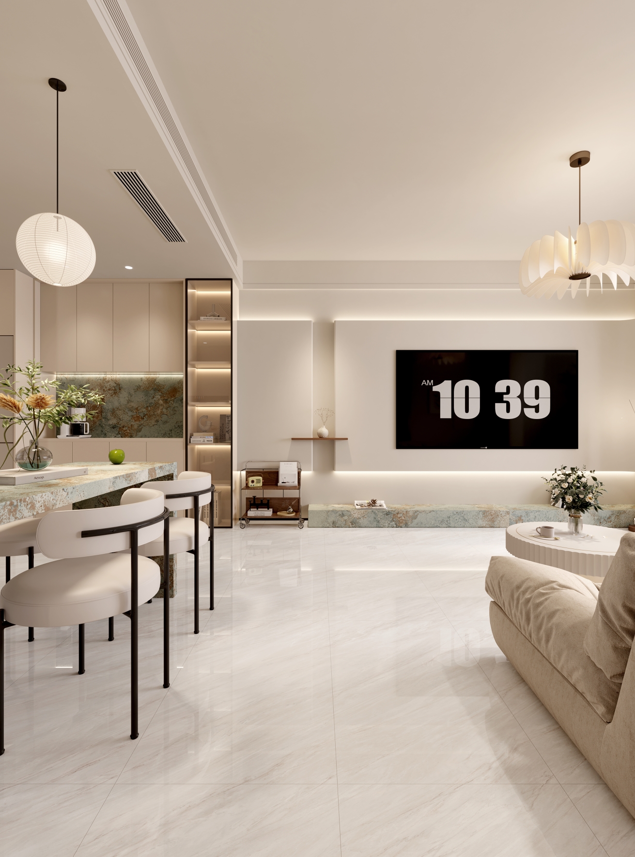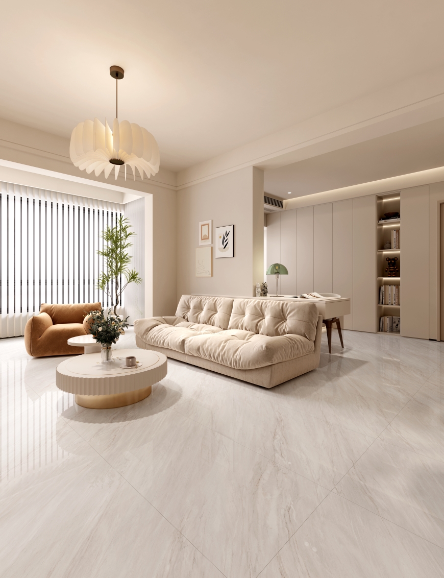 以淡雅米白色為基調,交織淺褐色紋理,如珊瑚暈染,又如玉石脈絡,盡顯優(yōu)雅質感,鋪貼后為空間增添一份高雅格調,營造出舒適且具有品味的家居氛圍。