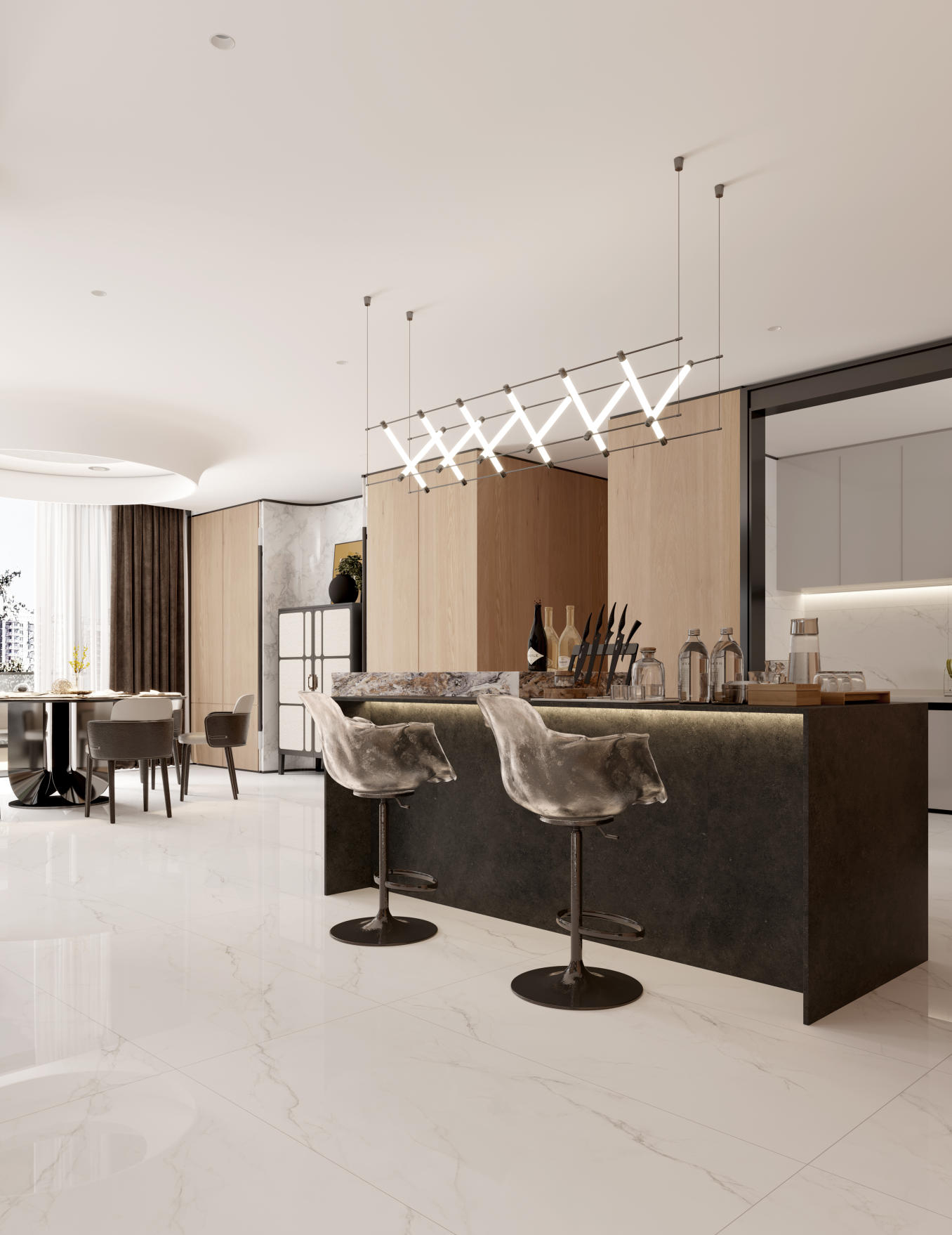白而不膩的底色上,肆意生長的灰色紋理,輕盈鎏金從容隨性,仿佛晨光微曦時破曉的天宇滿載著生命的力量,在光線輾轉(zhuǎn)處撒歡。