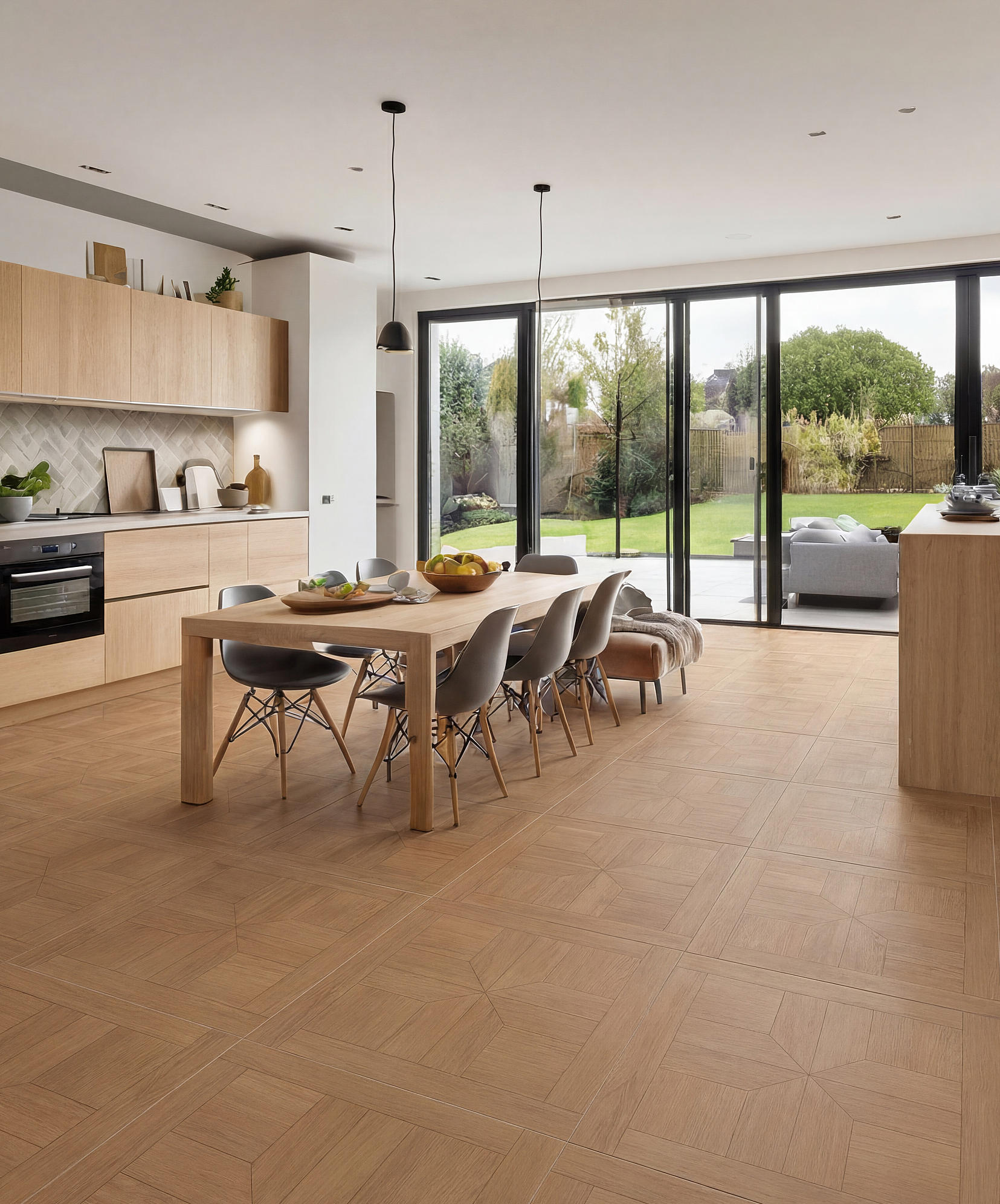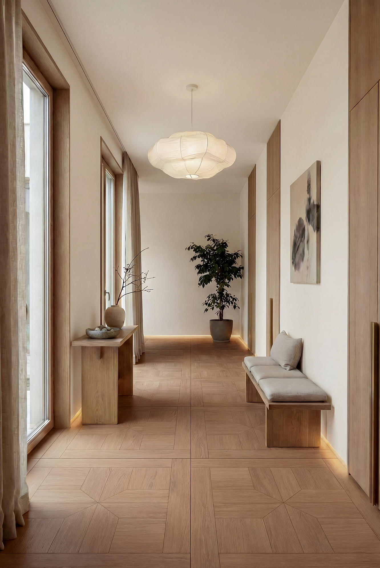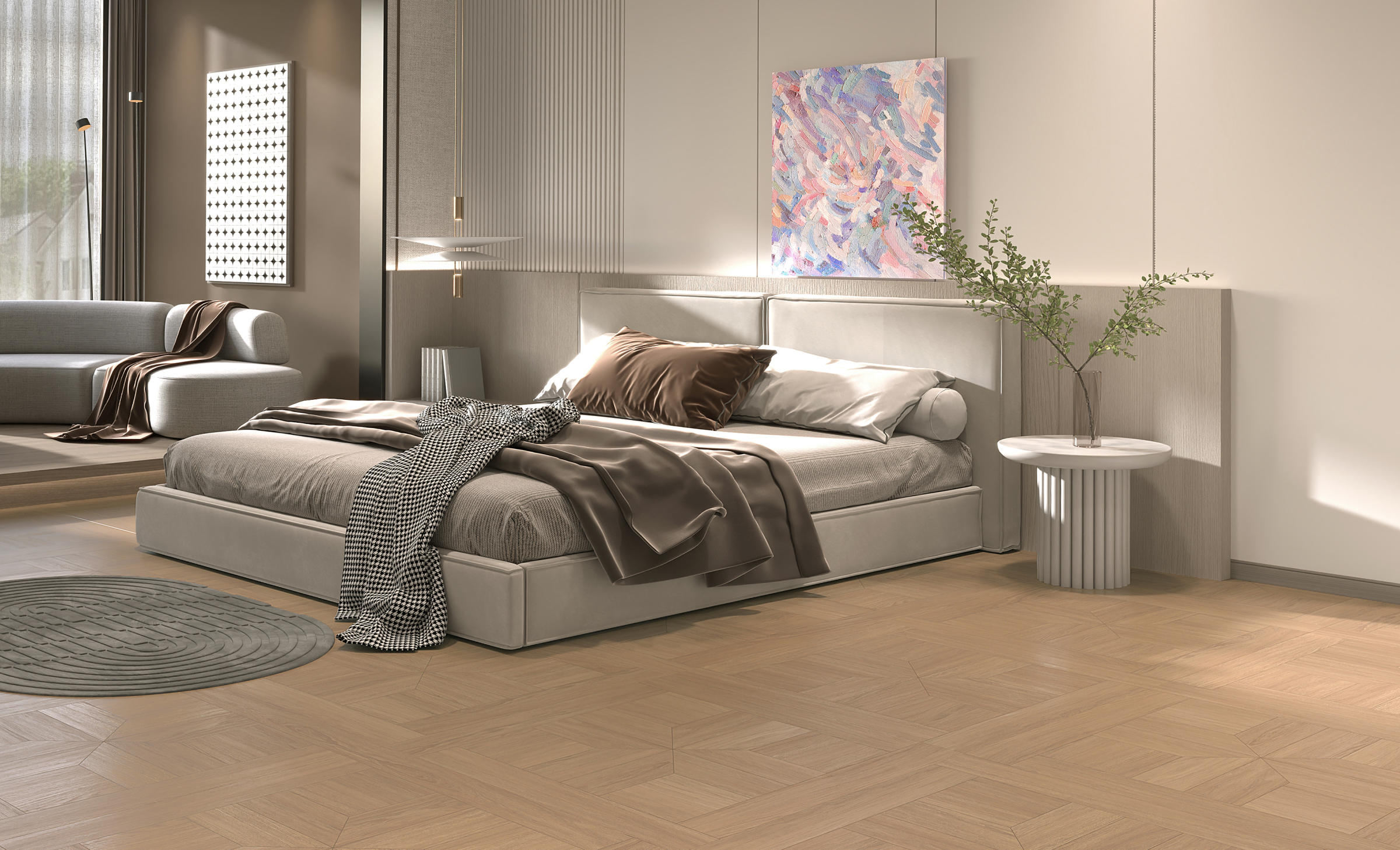 淺夏格調(diào)以萬字拼花為設(shè)計錨點,將幾何的秩序韻律,織入原生木色的溫柔肌理,打造讓空間有情緒、有質(zhì)感的生活載體,讓每一道木紋都承載著歲月沉甸甸鄂故事。
